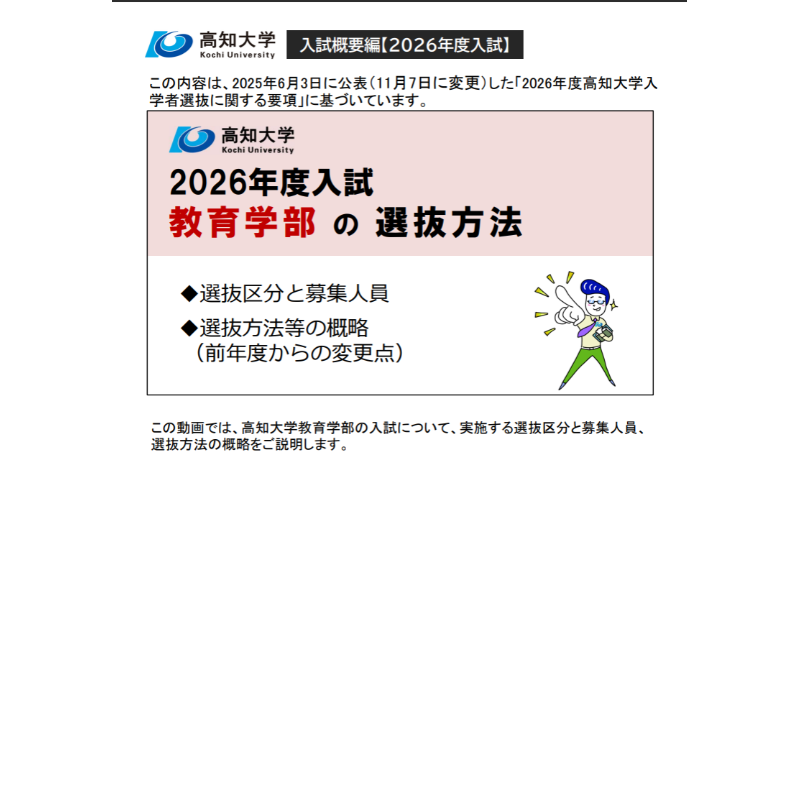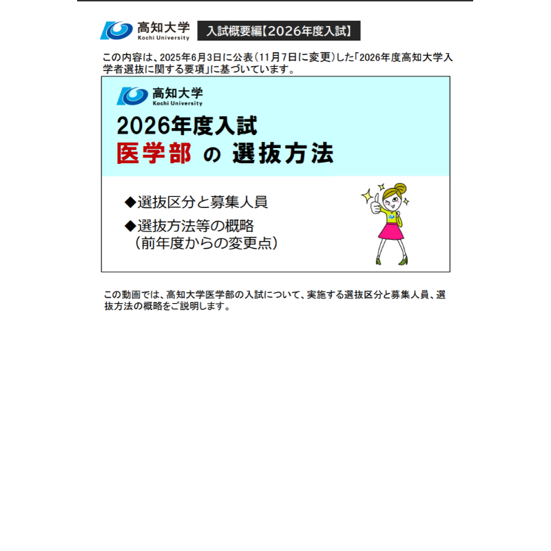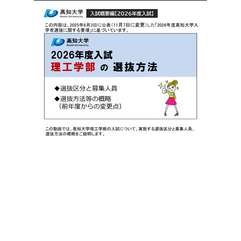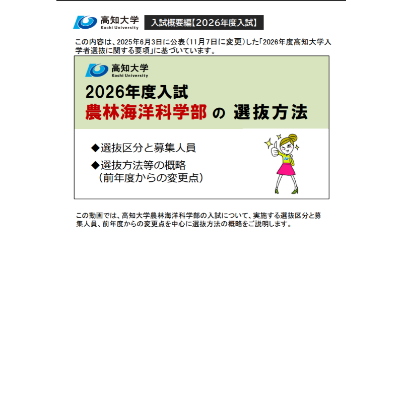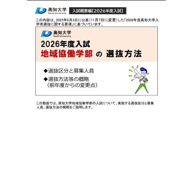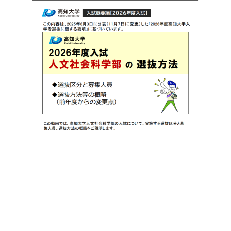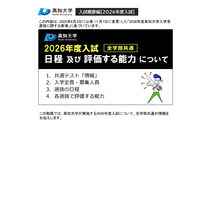 この動画の内容は,2025年6月3日に公表(11月7日に変更)した「2026年度高知大学入学者選抜に関する要項」に基づいています。